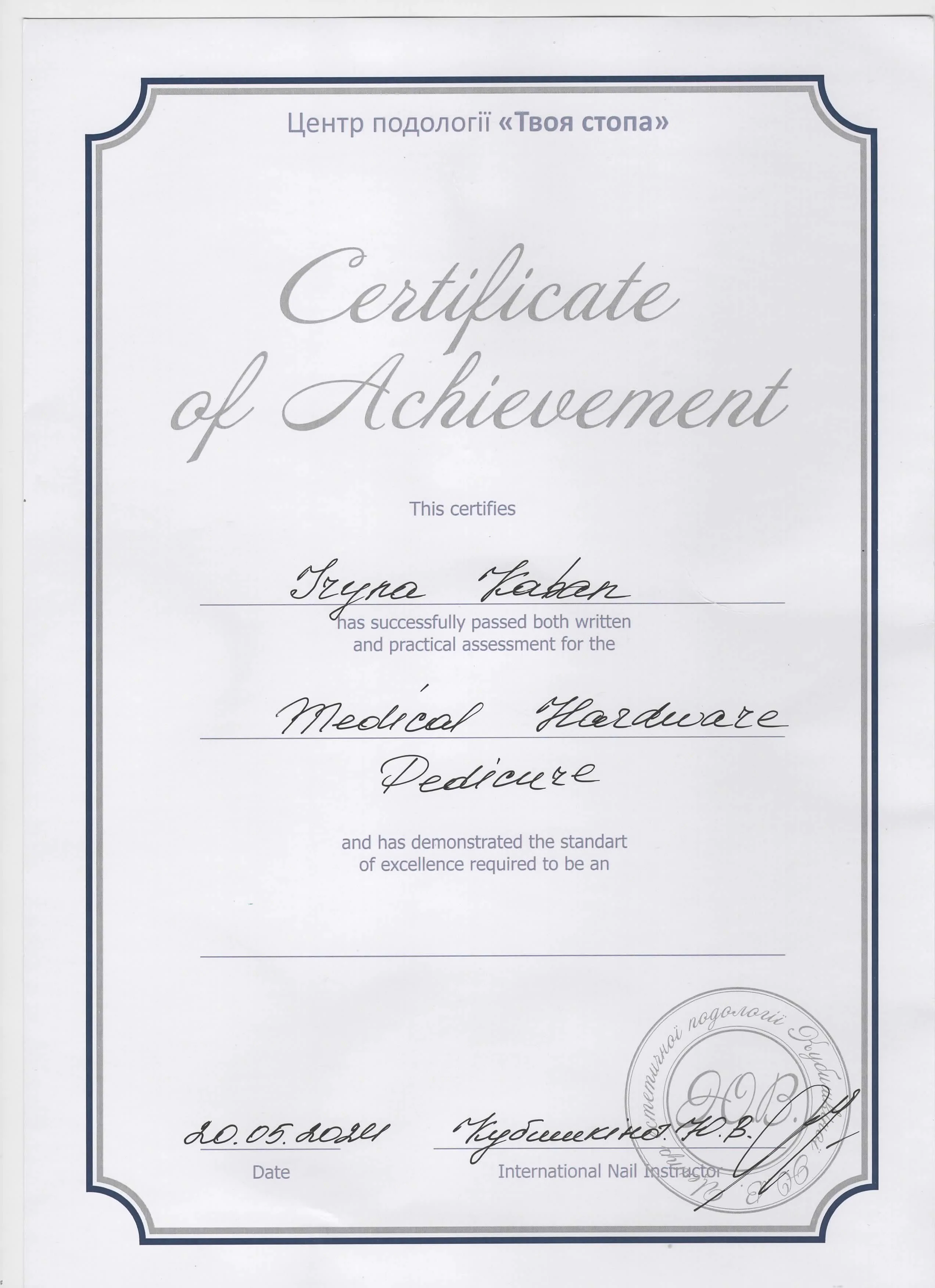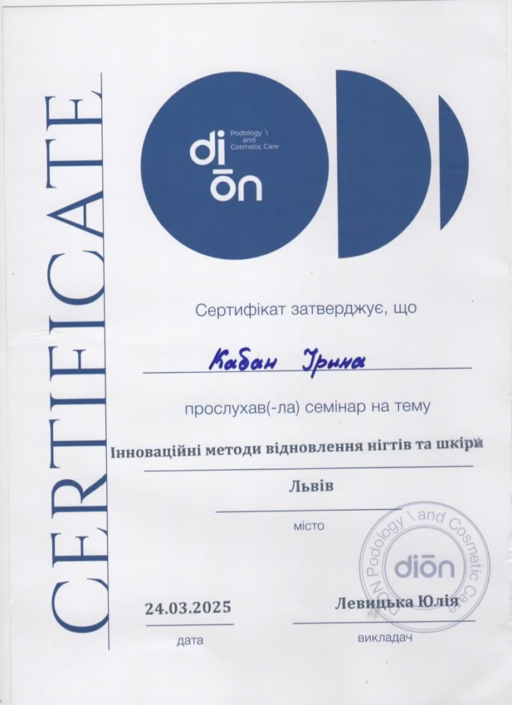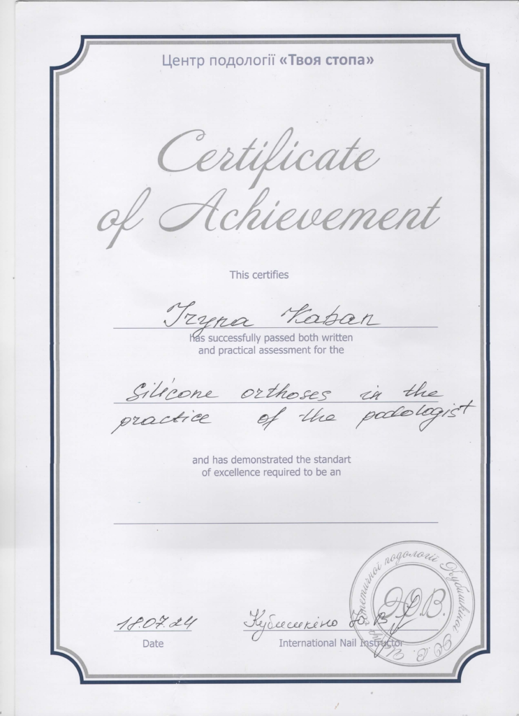 In 2023–2024, she successfully completed a full course in podology, as well as a training course on “Manufacturing Individual Orthoses,” which enables her to apply modern approaches to patient diagnosis and treatment. She is also a lecturer in podology courses.